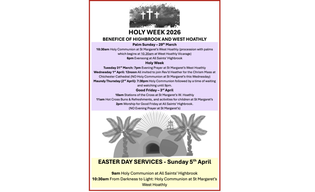 Safeguarding: Our Parish Safeguarding Officer is Lindsay Shurvell. Please see our safeguarding page for more details, but if in doubt, contact safeguarding@highbrookwesthoathly.org